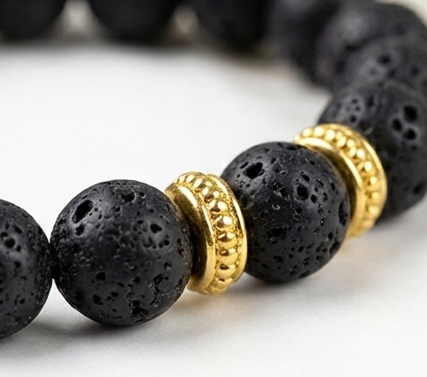 To maintain the integrity of the crystals and the gold-plated accents, avoid direct contact with harsh chemicals or abrasive surfaces. You may clean the lava beads by gently wiping them with a damp cloth. If using essential oils, apply a single drop to the lava stone and let it absorb fully before wearing.